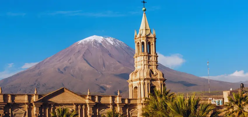A lesser-known Peru holiday spot, Arequipa shimmers in the high-altitude sunlight. Framed by the towering El Misti volcano, the city feels cinematic with its buildings carved from white volcanic sillar stone that glows honey-gold at dusk.