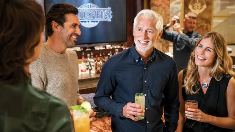 The wide choice of bars and lounges dotted around the ship, mean you're never too far from a drink. International Café presents 24-hour food and drink including freshly-baked goods and the New Grounds Crafted Coffee menu. Take your seat for ice-cold beers and tropical cocktails in SeaView Bar and WakeView Bar on Lido Deck. Sip imaginative, freshly-mixed cocktails in Bellini's or relax with signature martinis, frosty daiquiris, and the pianist tinkling the ivories 'Rat Pack' style in Crooners. Enjoy a pre-dinner glass of wine or two in Crown Grill Bar and savour classic whiskies and vintage brandies in the cosy ambience of Churchill's. Vista Show Lounge features comedians, illusionists, and live music. Under the sun or under the stars, top-deck parties welcome you to enjoy drinks, dance to a live band, and join in themed events.