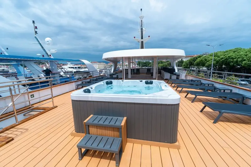 As you step on board, there’s an instant feeling of grandeur. With a maximum of 38 guests on board, your dedicated crew will be at your service throughout. Enjoy the spacious and stylish sun deck, discover a secluded spot to read a book, enjoy a relaxing dip in the hot tub or sit back, relax and unwind with a cool refreshing drink from the bar as you enjoy unimpeded panoramic views of the unspoilt landscapes of the Adriatic coastline.There’s a chance to enjoy a quick dip from the swimming platform in one of the secluded bays’ crystal clear waters.