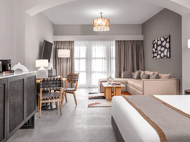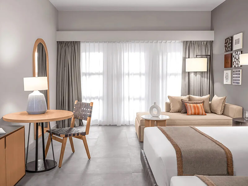 This Egyptian hotel offers 268 newly renovated rooms and suites across four categories, including Deluxe Rooms, Premier Rooms, Junior Suites, and Steigenberger Suites. Deluxe Rooms provide a choice of a king‑size bed or twin beds, along with a minibar, digital safe, and complimentary tea and coffee‑making facilities. The modern ensuite bathroom features a shower, hairdryer, and make‑up mirror. Each room also includes a private terrace or balcony furnished with a sun lounger, two chairs, and a table for relaxed outdoor moments.