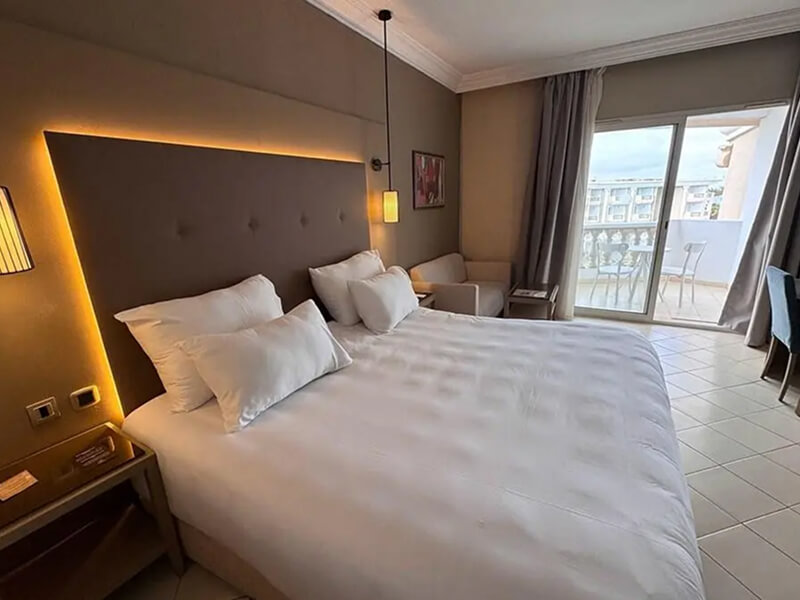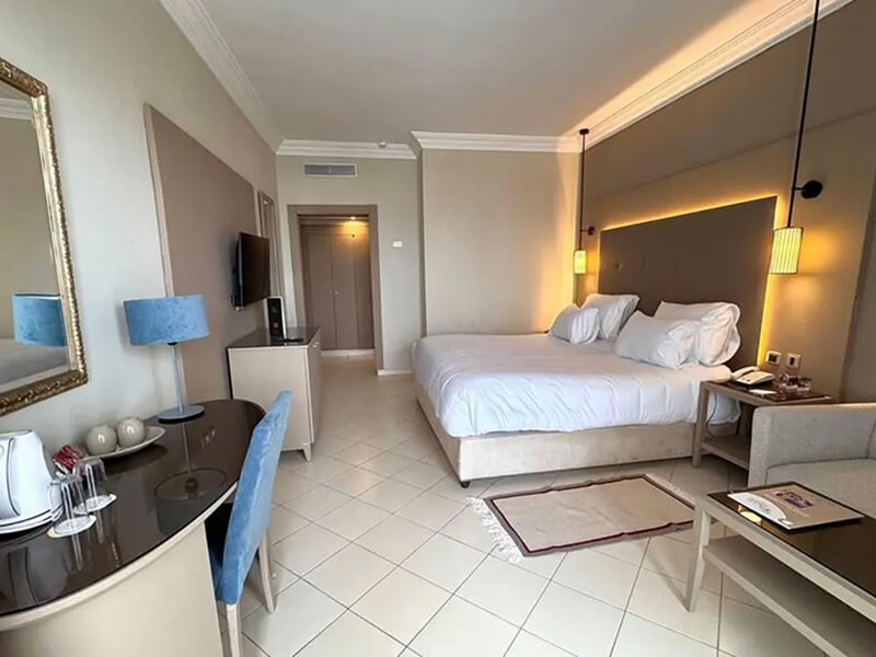Royal Thalassa Monastir has a total of 260 modern guest units; comprising Double, Single, Triple, and Superior Rooms; Junior, Executive, and VIP Suites; and the Presidential Suite. All rooms and suites are equipped with individual air-conditioning (hot and cold), direct-dial telephone, individual safe, minibar, Wi-Fi, digital satellite television with multilingual channels, a bathroom with hairdryer, and a terrace with a view of the sea, swimming pool, or gardens.