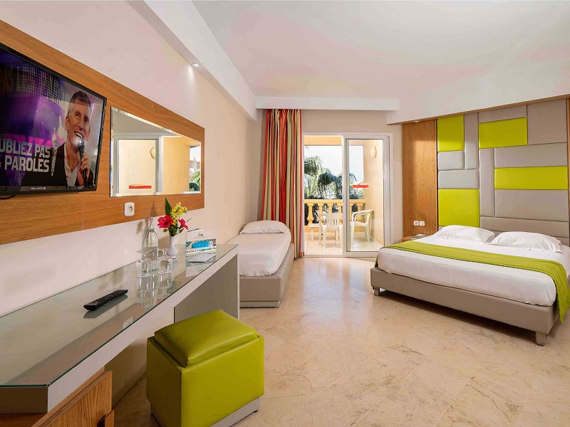 Yasmine Marina & Spa has a total 250 contemporary guest units across four categories; comprising Standard Double Rooms, Triple Rooms, Family Rooms, and also six Suites. Standard Double Rooms feature a bright and colourful décor and are kitted out with all the homestyle comforts for a relaxing stay in Hammamet - from a flat-screen satellite television, telephone, and complimentary mini-fridge to a safe, private balcony with chairs and table, and a bathroom with a hairdryer.