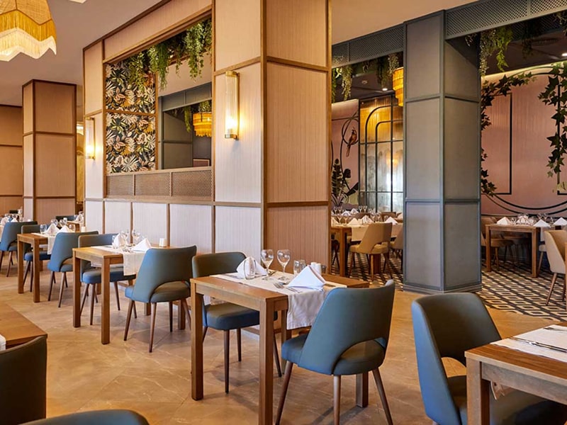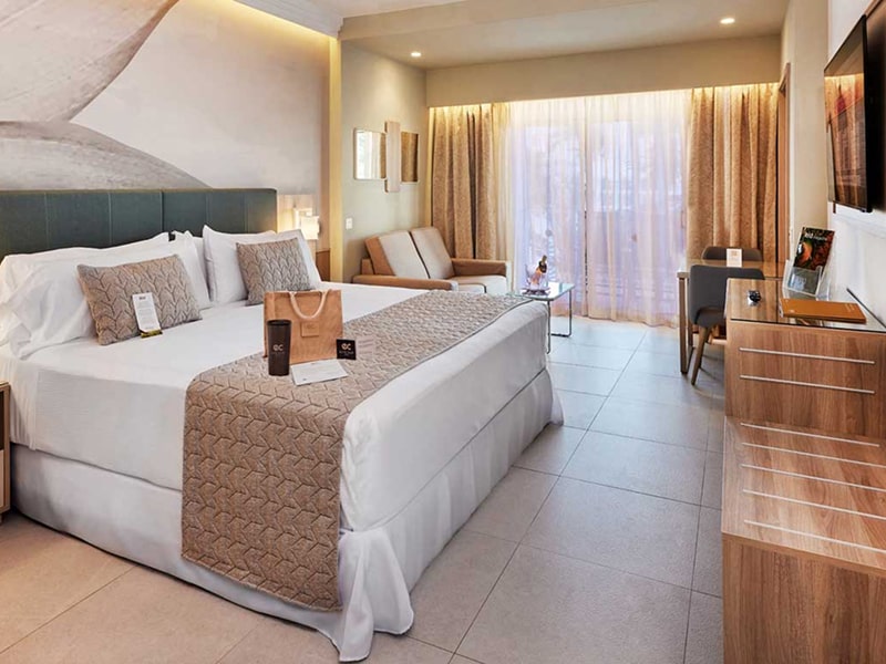 El Patio Restaurant serves a daily American breakfast buffet with live cooking stations, fruit, juices, and cava; a hot and cold buffet at lunch; and themed dinner buffets three times a week. À la carte options include Krystal Fusion for creative cuisine, Kabuki for Japanese flavours, Pancho Steakhouse for grilled favourites by the pool, and Volare for Italian classics. Capuchino patisserie and ice cream parlour offers cakes, pastries, and ice cream. Enjoy drinks at Coral poolside bar, Cubano Lobby Bar, or La Boheme Lounge Bar, each with a terrace and signature cocktails. Evening entertainment includes live shows, music at Copacabana Amphitheatre, late-night dancing at Pacha Discotheque, and Rio Pool Parties.