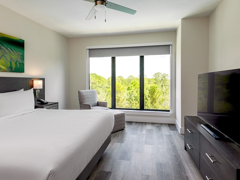 The Grove Resort offers spacious one to three-bedroom suites, perfect for families or groups. Each suite is fully furnished and designed with comfort in mind, featuring separate living and dining areas, a full kitchen, and in-suite laundry facilities. Modern amenities include flat-screen TVs, complimentary Wi-Fi, and private balconies with views of the pool, lake, or garden. The master bedrooms come with en-suite bathrooms, offering soaking tubs and walk-in showers. Suites also include conveniences like coffee makers, dishwashers, and ample storage, ensuring guests have everything they need for a comfortable extended stay.