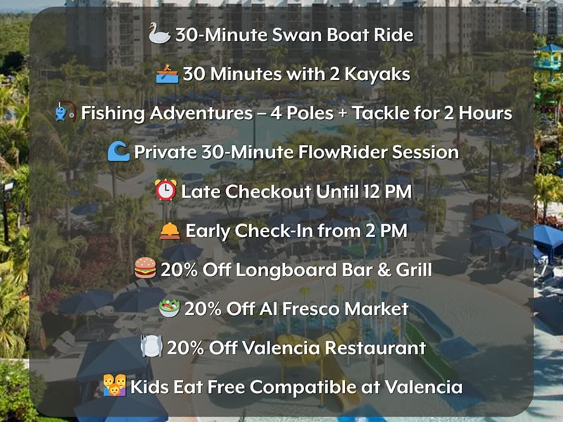 The Grove Resort & Water Park features an impressive array of facilities designed to entertain guests of all ages. The highlight is Surfari Water Park, which includes a lazy river, dual water slides, a wave simulator, and multiple pools. For a more relaxed experience, the resort offers a tranquil lakefront area with water sports, boat rentals, and fishing. The resort also has a fully equipped fitness center, a luxurious spa, and an arcade with games for kids and teens. Additional amenities include complimentary shuttle service to Disney World, a 24-hour convenience store, and meeting and event spaces.