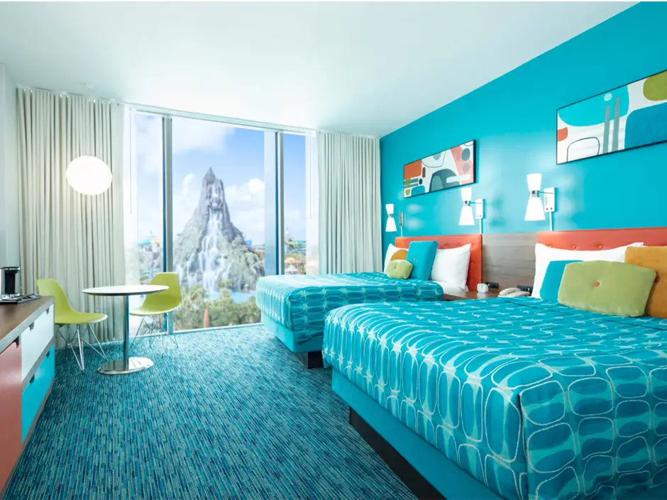 All guest rooms at Universal’s Cabana Bay Beach Resort blend retro style with modern convenience. Standard and Volcano Bay‑view rooms offer two queen beds, a 40″ flat‑screen TV, mini‑fridge, Cuisinart coffee maker, free Wi‑Fi, in‑room safe, iron/ironing board, hairdryer and telephone. Family and two‑bedroom suites add a living area, kitchenette (mini‑fridge, microwave, sink), partitioned sleeping spaces, extra TVs and a spacious multi‑compartment bathroom. All rooms feature smart HVAC controls and offer early park admission benefits.