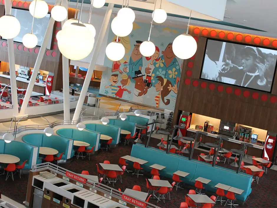 Universal’s Cabana Bay Beach Resort offers a vibrant selection of food, drink, and entertainment for all ages. The Bayliner Diner food court serves breakfast through dinner, with stations for burgers, pizza, pasta, salads, frozen yogurt, wine, and beer. Galaxy Bowl combines a full-service restaurant with retro bowling, offering burgers, wings, pizza, cocktails, and beers. Poolside, Atomic Tonic and The Hideaway Bar & Grill serve snacks, sandwiches, salads, frozen and crafted drinks. Swizzle Lounge in the lobby offers throwback cocktails with live music on weekends. A Starbucks provides premium coffee and light bites. Room pizza delivery is also available.