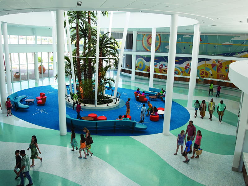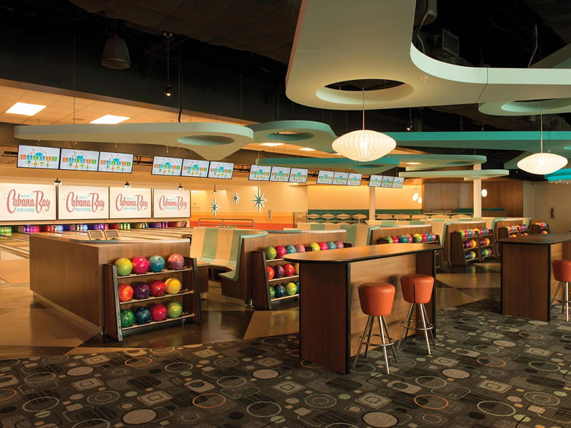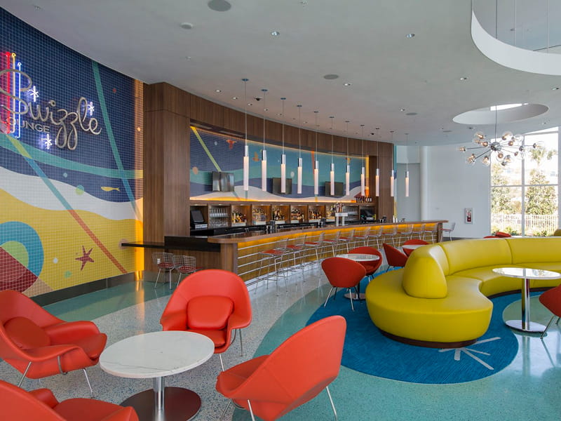 Universal’s Cabana Bay Beach Resort offers a vibrant selection of food, drink, and entertainment for all ages. The Bayliner Diner food court serves breakfast through dinner, with stations for burgers, pizza, pasta, salads, frozen yogurt, wine, and beer. Galaxy Bowl combines a full-service restaurant with retro bowling, offering burgers, wings, pizza, cocktails, and beers. Poolside, Atomic Tonic and The Hideaway Bar & Grill serve snacks, sandwiches, salads, frozen and crafted drinks. Swizzle Lounge in the lobby offers throwback cocktails with live music on weekends. A Starbucks provides premium coffee and light bites. Room pizza delivery is also available.