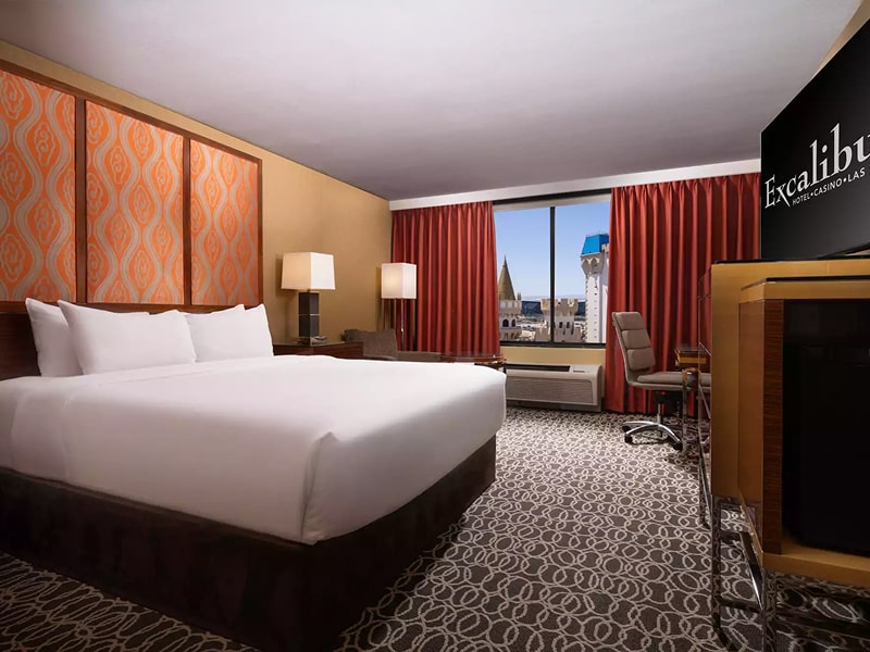 Excalibur Hotel & Casino blends fairy-tale charm with modern comfort. It offers three main room types: Tower Rooms with warm tones and hardwood furnishings; Contemporary Rooms featuring flat-screen TVs, pillow-top mattresses, and sleek bathrooms; and Guest Suites with separate living and dining areas, refrigerator, marble shower, and upgraded amenities. All rooms include air-conditioning, hairdryer, safe, cable TV, coffee/tea facilities, and Wi-Fi. Despite its castle-like exterior, interiors are stylish and practical, designed for a relaxing stay. Some amenities may incur additional charges.