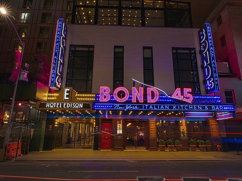 Hotel Edison offers a range of on-site amenities including a 24-hour fitness center, business lounge, concierge service, and complimentary Wi-Fi in public areas. Guests can enjoy a gift shop, valet parking*, and dry cleaning/laundry services*. The hotel also features live music receptions, neighborhood walking tours, and expert tour assistance. Dining options include Friedmans, Bond 45, and The Rum House bar. With Times Square and Broadway just steps away, the hotel provides everything needed for a comfortable and memorable New York stay. (*Additional charges may apply.)