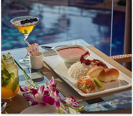 Cosmos combines a partially open deck overlooking the Arabian Sea with a stunning menu of international cuisine. The exotic poolside Sunken Bar is your port of call for freshly mixed cocktails and mocktails, single malts, round-the-world wines, and Indian, continental, and oriental snacks. Bar-be-que by the Pool serves up everything from signature seafood dishes like Lobster Thermidor and Royal Seafood Platter and local delicacies such as Crab Xec Xec to grills, sizzlers, and steaks. Sing to your heart’s content in the Karaoke Lounge.
