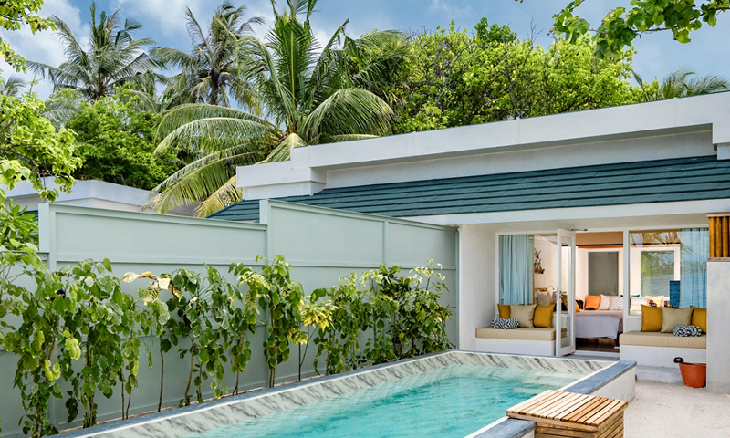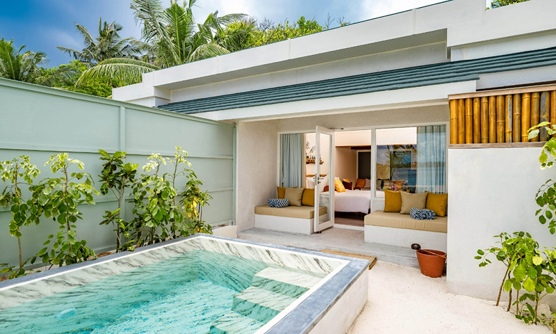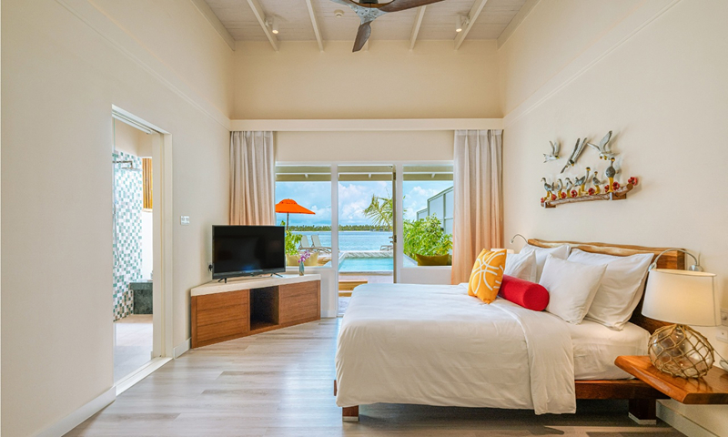 This Maldives luxury hotel has 153 guest units across eight categories; ranging from Deluxe Beach Villas to Sunset Water Suites With Pool. The Deluxe Beach Villas are moments from the beach and feature tropical accents and a picturesque window seat and welcome touches like a semi open-air bathroom with robes, slippers, and hairdryer; IDD telephone, a daily-replenished minibar with bottled water and snacks, safe, espresso machine, air-conditioning, ceiling fan, complimentary Wi-Fi, large flat-screen LCD television, signature beach bag, and outdoor veranda/deck.