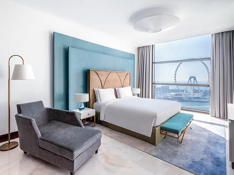 Sofitel Dubai Jumeirah Beach offers 444 contemporary rooms and suites, each with private balcony and panoramic views of the Arabian Gulf, Bluewaters Island, or Palm Jumeirah. Rooms feature Sofitel’s signature MyBed™ concept with plush bedding, modern bathrooms with rain showers and bathtubs, luxury amenities, and elegant décor blending French art de vivre with Arabian style. Guests enjoy complimentary Wi‑Fi, flat-screen TVs, minibars, 24‑hour room service, and thoughtful touches like turndown service, ensuring a refined and comfortable beachfront stay.
