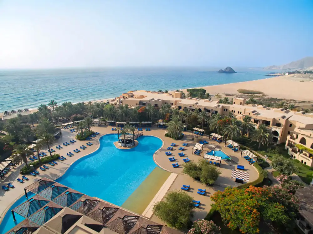 Nestled between the Hajar Mountains and the Gulf of Oman, this Moroccan‑style beach resort features 321 elegantly furnished rooms and suites with private balconies overlooking the ocean or mountains. Guests can enjoy outdoor and indoor pools, a private beach with water‑sports, spa with saunas, steam rooms, hot tub, and a fitness centre. Dining includes Middle Eastern, Italian, and Asian options alongside live music and traditional entertainment. Family‑friendly amenities include a kids’ club, children’s pool, and playroom.