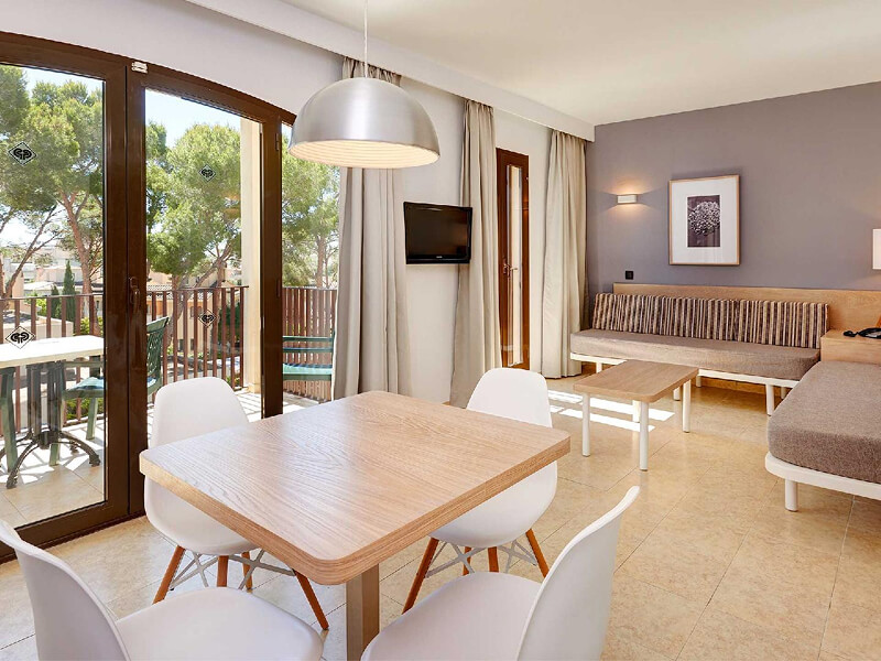 Protur Floriana Resort Aparthotel has a total of 315 modern guest units; comprising 1 Bedroom Apartments, 2 Bedroom Apartments, and Apartments with Hydromassage. 1 Bedroom Apartments are kitted out with air-conditioning/heating, balcony with table and chairs, bedroom with twin single beds, lounge with two sofa beds, direct-dial telephone, and LCD satellite television; safety deposit box, bathroom with bathtub/shower combination and WC, complimentary Wi-Fi, single-use plastic free, and a kitchenette with fridge, microwave, toaster (on request), kitchen utensils, and tea/coffee making amenities.