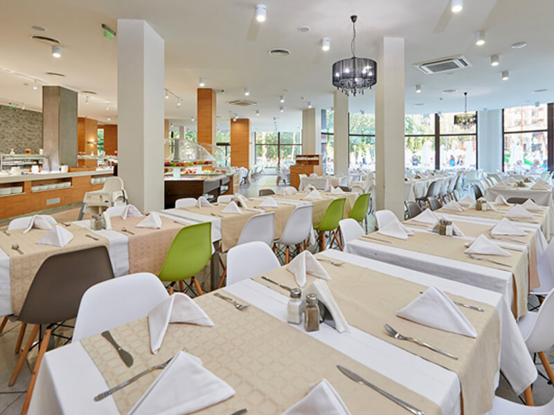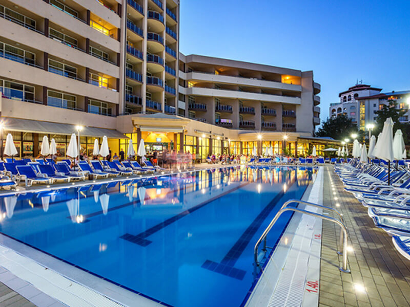 This Sunny Beach hotel has a total of 365 modern guest units; comprising Standard Twin Rooms, Studios/Double Superior, Apartments, Two Level Maisonettes/Duplex 2, and One-Level Maisonettes/Duplex 1. Standard Twin Rooms are kitted out with a balcony with clothes dryer, chairs, and table; twin beds, fold-out armchair or sofa bed, air-conditioning, telephone, minibar, cable television, and bathroom with shower cabin, sink, hairdryer, magnifying mirror, telephone, and WC.