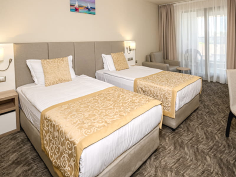 This Sunny Beach hotel has a total of 365 modern guest units; comprising Standard Twin Rooms, Studios/Double Superior, Apartments, Two Level Maisonettes/Duplex 2, and One-Level Maisonettes/Duplex 1. Standard Twin Rooms are kitted out with a balcony with clothes dryer, chairs, and table; twin beds, fold-out armchair or sofa bed, air-conditioning, telephone, minibar, cable television, and bathroom with shower cabin, sink, hairdryer, magnifying mirror, telephone, and WC.