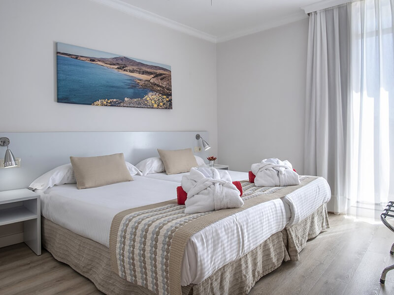 This Costa Teguise hotel has a total of 324 modern Standard Suites, Junior Suites, and also Senior and Family Suites with Two Bedrooms. Standard Suites feature a kitchenette with microwave, glass-ceramic hob, fridge, coffee/tea maker, cutlery/crockery, and cooking utensils; air-conditioning, terrace or balcony, telephone, complimentary Wi-Fi access, safe to hire, wake-up service, one bedroom with two single beds, living room with two single sofa beds, 32-inch LED television, and bathroom with shower, WC, and hairdryer.