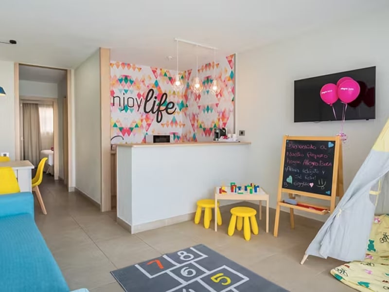 The hotel features 312 modern units across six categories, from Apartments to Deluxe Apartments. Each offers a balcony or terrace, a bright living and dining area with sofa bed, air‑conditioning, television, and Wi‑Fi. A handy kitchenette includes a microwave and sink, while the separate twin bedroom adds extra comfort. You’ll also find a minibar, safe, and a well‑equipped bathroom with shower, WC, makeup mirror, and hairdryer, creating a convenient base for a relaxed stay.