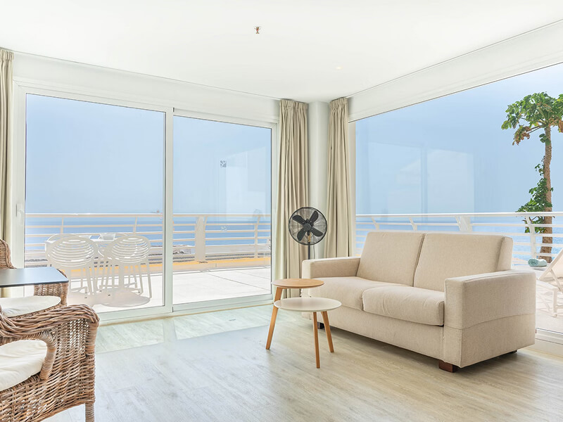 Studios, suites and one-bedroom apartments offer spacious, light-filled interiors inspired by the colours of sea and sky. Each features a fully equipped kitchenette, private bathroom, additional sofa bed, WiFi and comfortable living areas designed for relaxed independence. Many rooms include sun-kissed balconies with sweeping ocean views towards La Gomera, creating the perfect setting for morning coffee or golden hour moments overlooking Tenerife’s volcanic coastline.