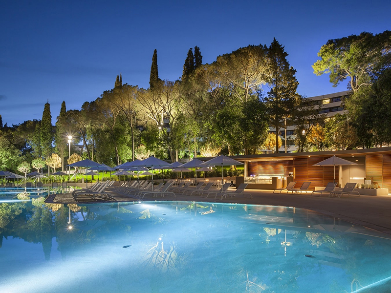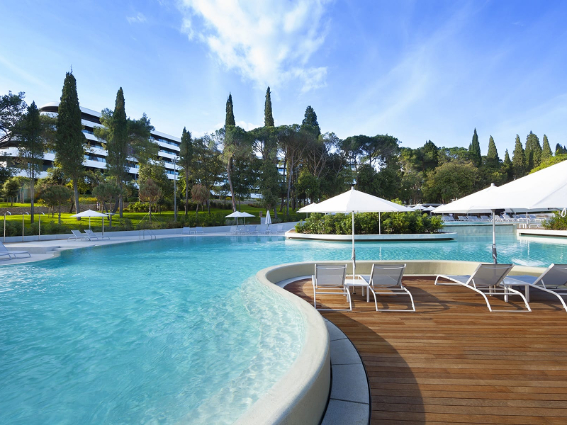 Hotel Lone’s 248 rooms offer modern decor, air conditioning, and soundproof windows for restful nights. Each includes flat-screen TVs, minibars, spacious bathrooms with bathtubs and showers, and complimentary toiletries. Private balconies or terraces provide serene views of the forest or Adriatic coast, blending comfort with natural beauty.