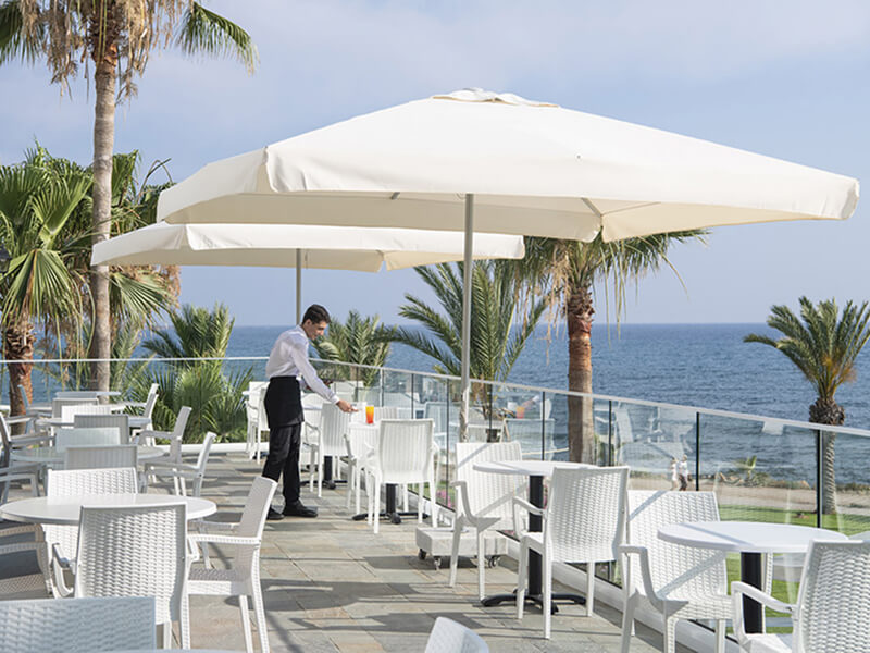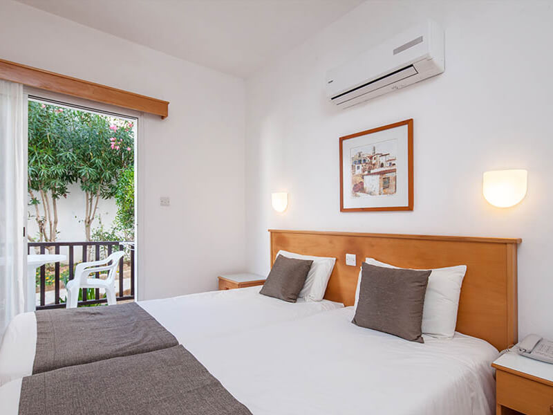 This Paphos hotel has a total of 173 spacious and well-equipped guest spaces, comprising Studio Apartments, One Bedroom Apartments, and Two Bedroom Apartments. Studio Apartments feature two single beds, a balcony or patio, bathroom with bathtub, complimentary Wi-Fi access, air-conditioning, satellite TV, toiletries, hair dryer, safe, telephone, kitchenette, and coffee/tea maker.
