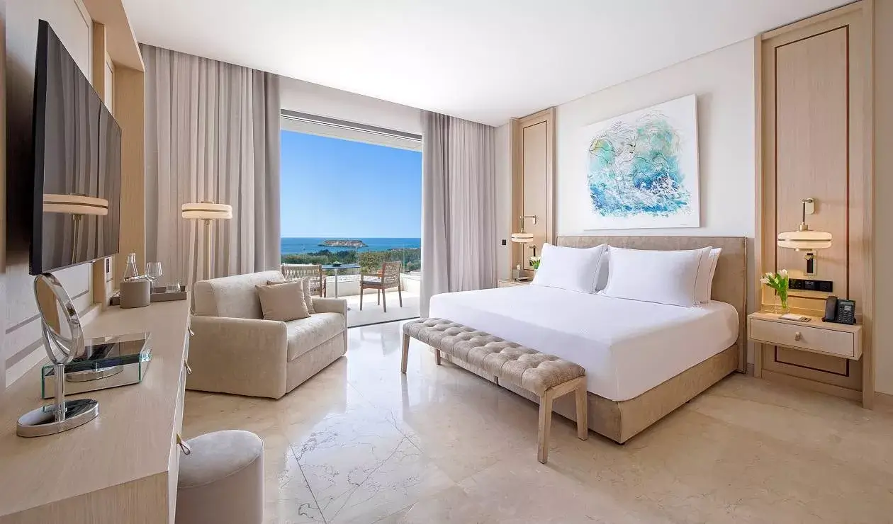 Cap St Georges Hotel & Resort features 202 mostly sea-view rooms and suites, from Cap Thalassa Rooms to Residence Rooms with Private Pools. Cap Thalassa Rooms include panoramic windows, a terrace, a king-size bed with a pillow menu, a pull-out sofa, air-conditioning, a minibar, a 55-inch Smart TV, Wi-Fi, a safe, USB plugs, 24-hour room service, a Nespresso machine, luxury toiletries, and a freestanding bathtub. Additional amenities include babysitting, baby accessories, laundry services, and Hoteza Guest Engagement System.
