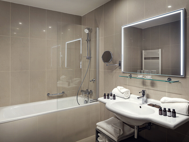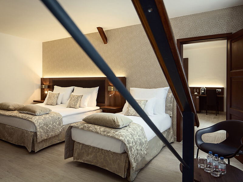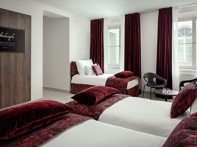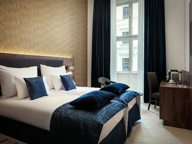 This Prague hotel has 134 guest rooms and across four categories; from Deluxe Double Rooms to Deluxe Suites. Relax after a day's sightseeing in the Deluxe Double Rooms; featuring a view of the courtyard or Prague, a king-size bed or twin beds with anti-allergy duvets, blackout blinds, mini-fridge, flat-screen television, safe, complimentary Wi-Fi, a Nespresso machine, complimentary daily bottle of water, slippers, mini sewing kit, an umbrella and iron on request, and a bathroom with bathtub or shower, bathrobes, and luxury toiletries.