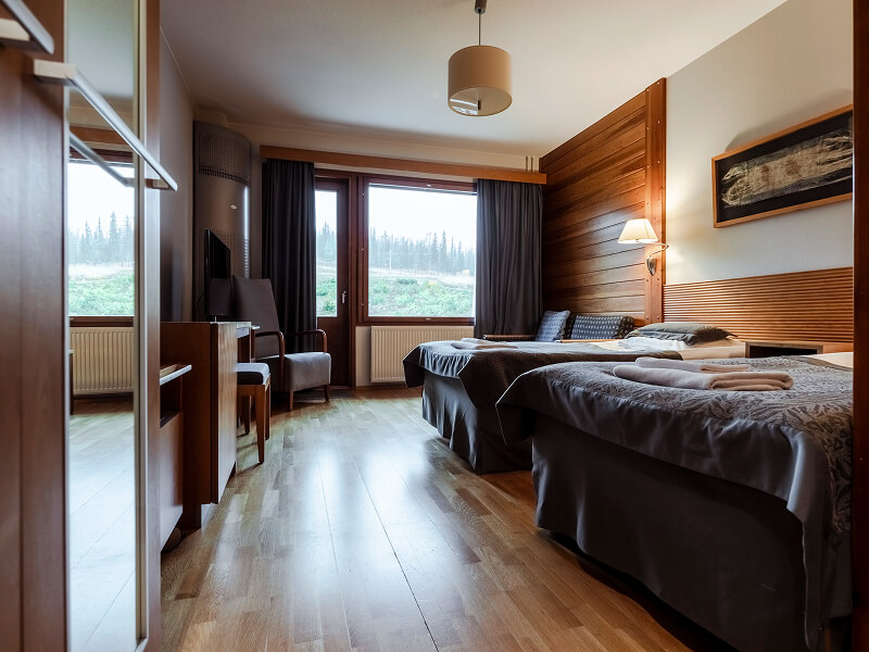 This Lapland hotel has a total of 184 guest units; 84 hotel rooms and 100 apartments. Double standard rooms come with a modern decor, skyline or mountain views, two single beds, double sofa bed, bathroom, television, computer connection, complimentary Wi-Fi Internet access, hairdryer, and clothes-drying cupboard. Most rooms also have a balcony or terrace.