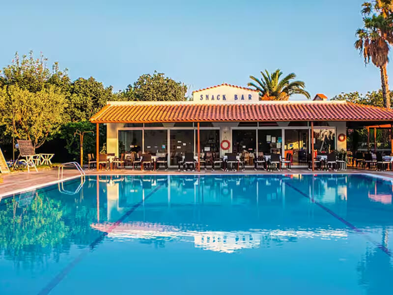 The main restaurant serves buffet-style local Greek and international dishes and the a la carte taverna/snack bar offers light options for lunch, including salads, pasta and ice cream. The main bar has an extensive cocktail menu, while the pool and garden bars combine drinks with spectacular views.
