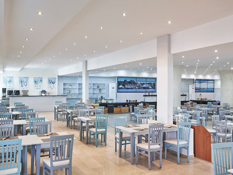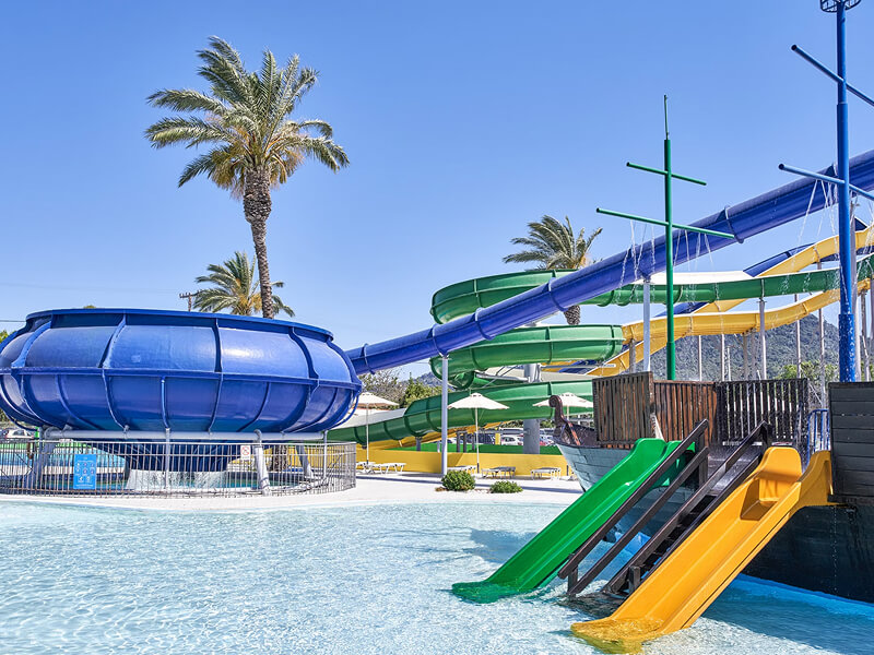 There are a total of six restaurants and three bars at Labranda Blue Bay Resort. Dionysos and Garden Main Restaurants are open for buffet-style fare. You can also enjoy Thalassa a la carte Restaurant, the Italian-style Pizza Trattoria, Greek dishes at Mouses taverna, and tasty burgers at Old West Burger House. Hot and cold drinks are served at Iris Main Bar, Poseidon Beach & Pool Bar, and Aquapark Pool Bar. Pool & Snack Bar is open for light bites and drinks too. The evening entertainment includes karaoke nights, Greek nights, and evening shows.