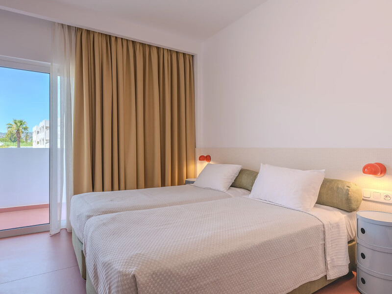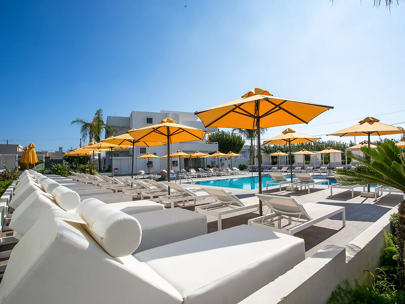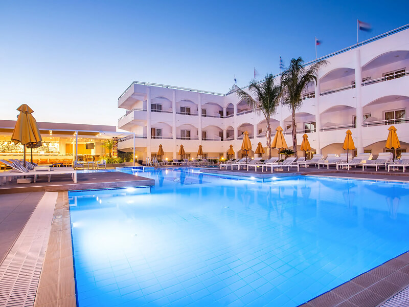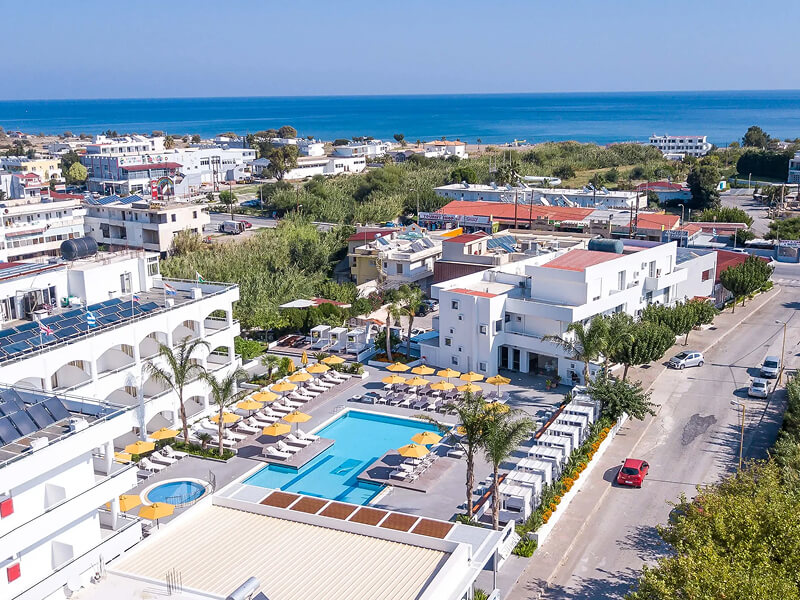 This Faliraki hotel has a total of 109 bright and airy Double/Twin and Deluxe Double Rooms. All rooms feature air-conditioning, furnished balcony, double or twin beds, bathroom with shower, flat-screen satellite TV, alarm clock, telephone, hairdryer, and fridge.