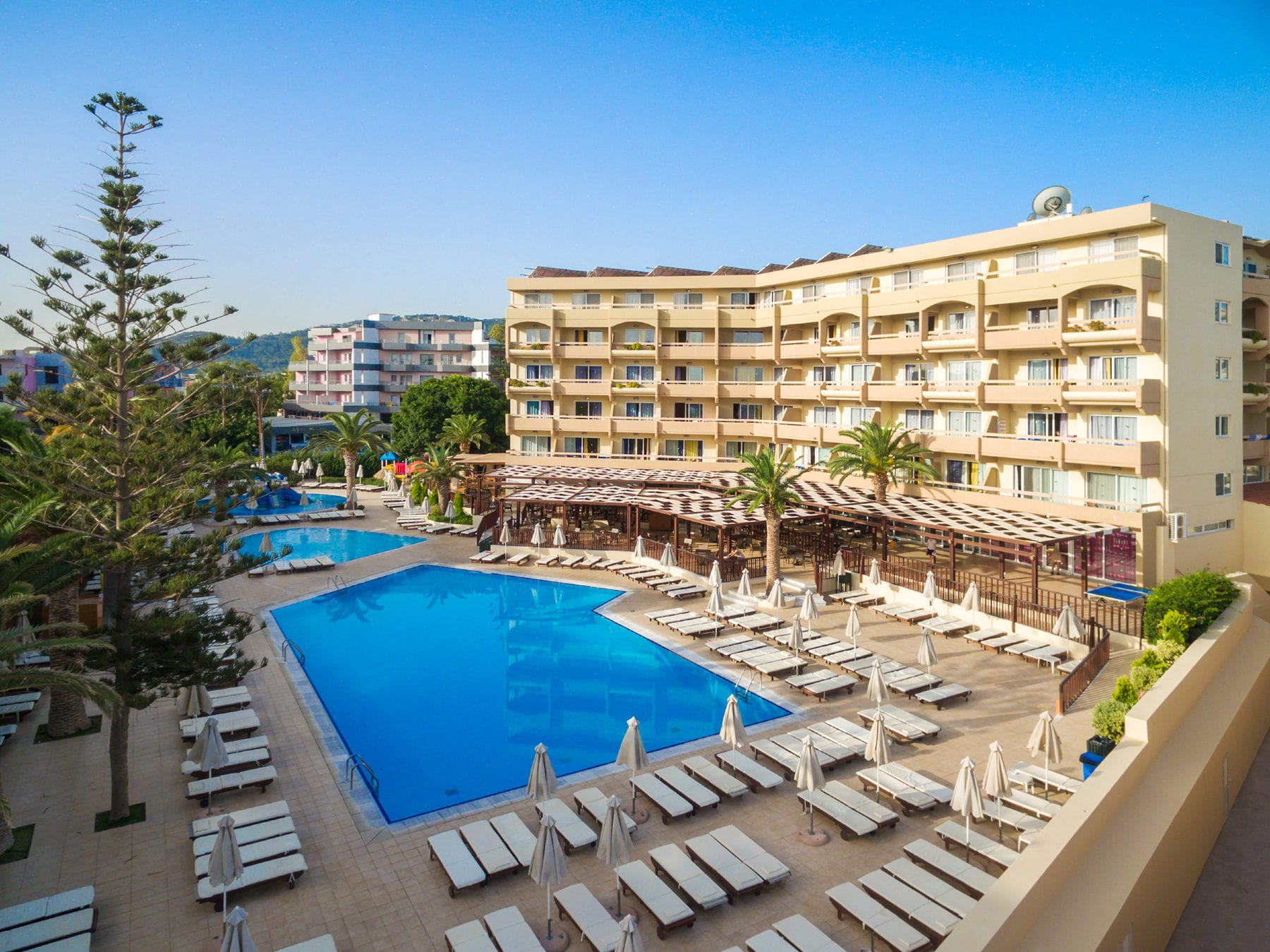 This Ialyssos hotel has a total of 330 spacious and well-equipped guest units, comprising Standard, Superior, and Family Guestrooms up to Premium Guest Rooms, Premium Family Apartments and Aegean Deluxe Suite Apartments. All Standard Guest Rooms feature air-conditioning, complimentary Wi-Fi access, furnished private balcony or terrace, bathroom with shower attachment, 32-inch satellite TV, telephone, safe, hairdryer, and mini-fridge.