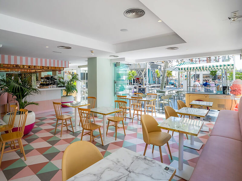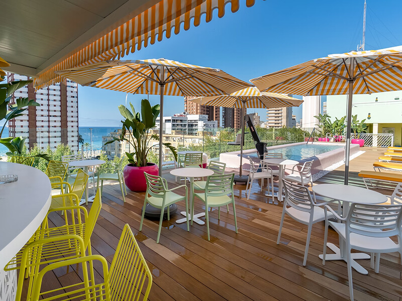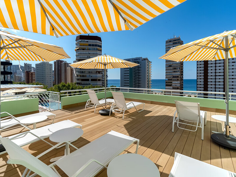 The main restaurant serves a tasty combination of buffet-style and waiter-served breakfasts, followed by a waiter-served three-course menu for dinner. You can also choose to dine on the large sunny terrace or tuck into local tapas and drinks in the bar cafeteria. The cocktail bar on the rooftop is the perfect place to enjoy tropical cocktails as you take in the views of Benidorm, the Mediterranean Sea, and beyond.
