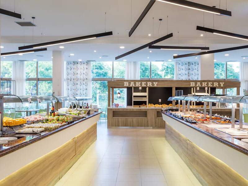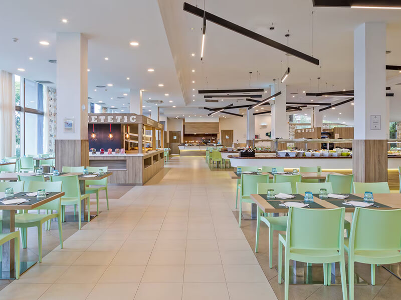 The onsite restaurant is a buffet-style restaurant for breakfast, lunch and dinner. There are also three bars in total. There is a pool bar, a lobby bar and a snack bar; all of which sell light snacks and bites to enjoy while relaxing onsite. There is also an English pub onsite The Kingdom of the Pint. Here, youll be able to choose from typical pub grub such chips, pizzas, hamburgers, chicken wings, chicken nuggets and onion rings.