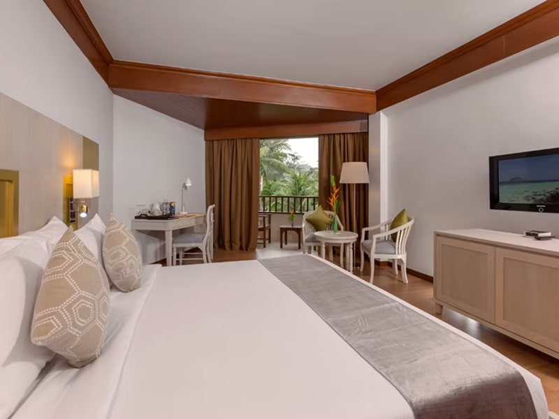 This Thai resort offers 235 rooms and suites across seven categories, from Deluxe (Villa Wing) Rooms to spacious Junior Suites. Each non-smoking Deluxe Room includes twin beds, air-conditioning, a balcony or terrace with garden views, minibar, tea and coffee facilities, complimentary Wi-Fi, TV, and safe. Bathrooms feature robes, slippers, toiletries, hairdryer, and shower. Baby cots are available on request.
