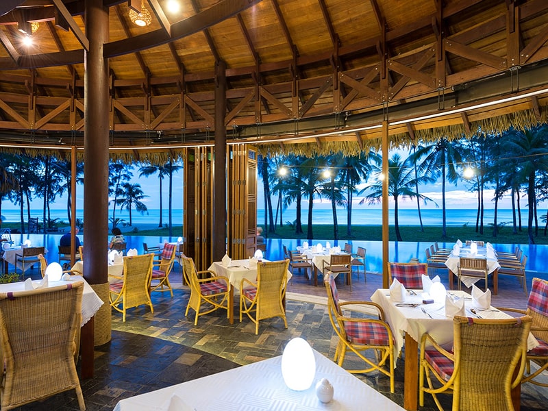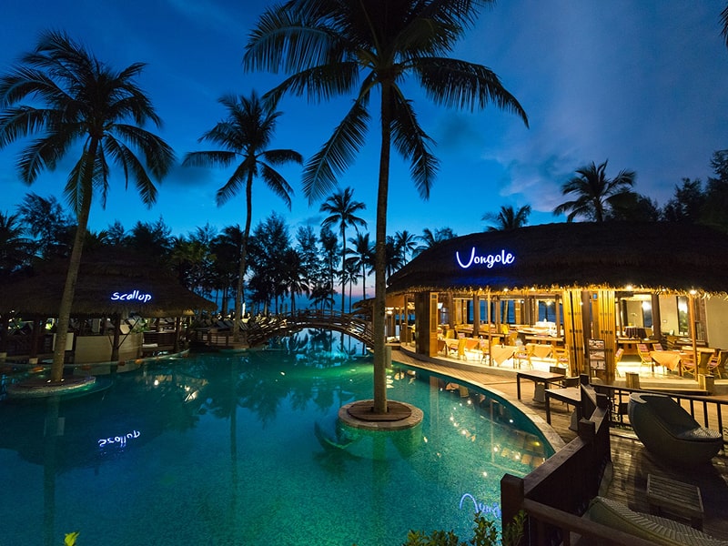 Start your day with made-to-order eggs and waffles at the Sundial buffet restaurant, where the terrace overlooks the Andaman Sea. For lunch and dinner, Vongole serves European and Thai fusion dishes, with fresh seafood, homemade desserts, and fine wines. Drinks are on offer at the Vongole swim-up bar or the Angel Wing bar, where cocktails and smoothies come with sunset views. Entertainment is low-key, with oceanfront seating and live music, while days can be spent enjoying yoga classes, beach volleyball, kayaking, or Thai cooking lessons.