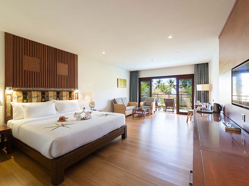 This Thailand hotel has a total of 110 spacious guest units across three categories; comprising Deluxe Rooms, Deluxe Pool Access Rooms, and Oceanfront Jacuzzi Villas. Deluxe Rooms are situated on the first floor and kitted out with a king-size bed or twin single beds, air-conditioning with individual climate control, balcony with sun loungers and garden or pool views, two umbrellas and flashlight, weight scale, complimentary Wi-Fi Internet access, minibar, complimentary coffee and tea making amenities, electronic safety deposit box, and bathroom with walk-in glass-enclosed shower, WC, bathrobes, slippers, hairdryer, and toiletries.