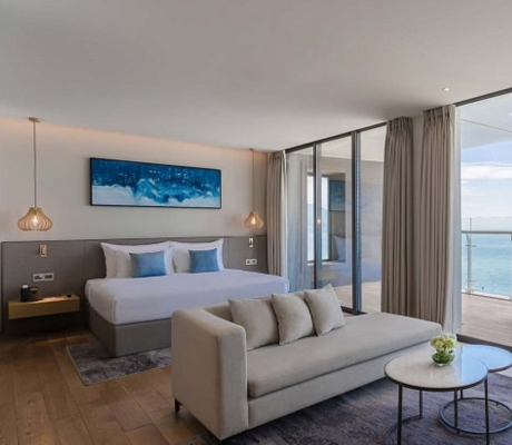 Sel de Mer Hotel & Suites in Da Nang offers 164 distinctive guest units across nine categories, including Superior Ocean View Rooms and luxurious Sel-De-Mer Ocean View Suites. Superior Ocean View Rooms feature stunning beachfront views from a private balcony, a king-size bed, seating area, flat-screen television, telephone, and air conditioning. The spacious bathroom includes a shower, vanity unit, WC, towels, toiletries, hairdryer, bathrobes, and slippers. Designed with soothing tones and natural light, each room provides a relaxing retreat. Guests enjoy modern comforts with thoughtful amenities, making it ideal for both leisure and business travellers seeking a stylish, comfortable stay by beautiful My Khe Beach.