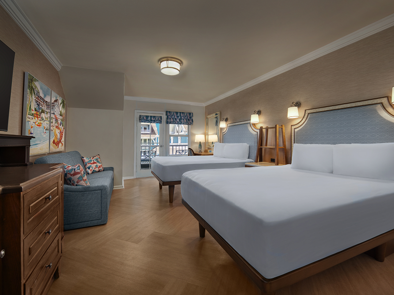 Disney’s Beach Club Resort rooms combine relaxed seaside style with modern convenience. Rooms feature either a king bed or two queen beds, with Deluxe Rooms offering a queen‑size sleeper sofa for extra space. All accommodations include a beverage cooler, coffee and tea station, flat‑panel TV, complimentary Wi‑Fi, in‑room safe, hairdryer, and iron with ironing board. Guests can unwind on a private patio or balcony. Studios and Villas provide additional living space, plus kitchenettes or full kitchens for added comfort.
