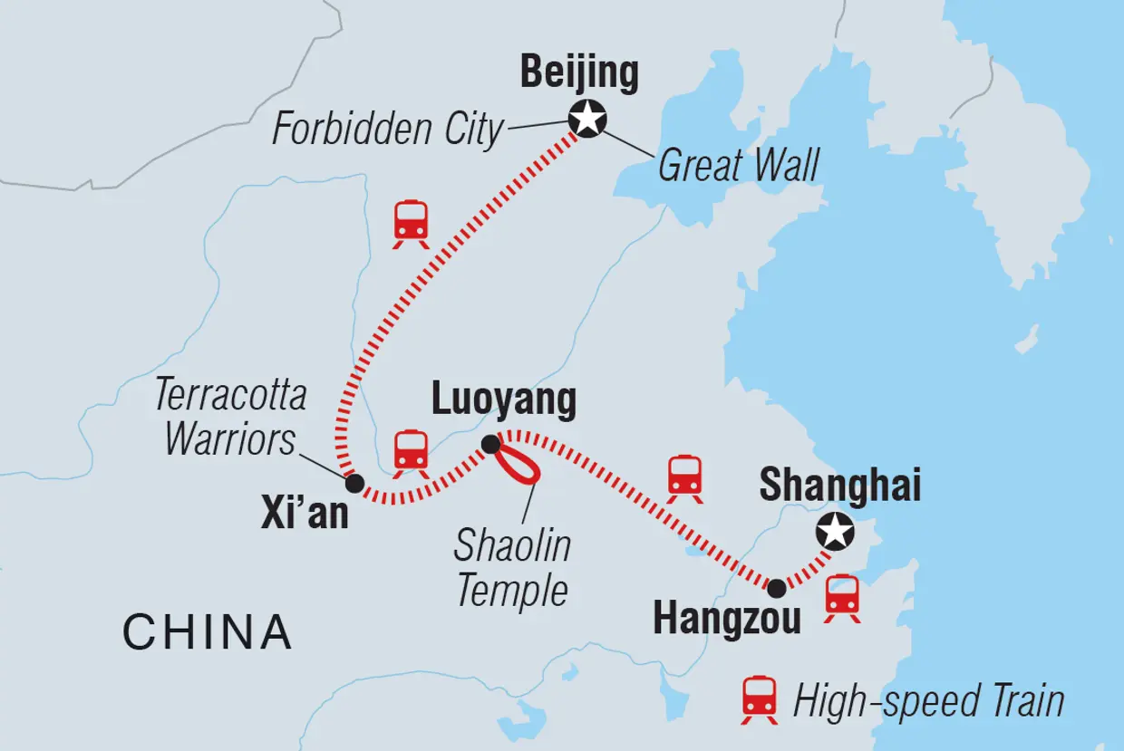 Capture the spirit of China on this 12-day trip from Shanghai to Beijing. From fast-paced modern cities to the well-preserved remnants of a long and storied history, this adventure reveals the many sides of one of the world’s great cradles of civilisation. It’s important to contrast the big and the bold with quiet moments and real connections. That’s why the tour of the Terracotta Warriors finishes with lunch at a local family home and why time at Shaolin temple, the birthplace of kung fu, is contrasted with boisterous Beijing. Whether you’re scaling the Great Wall or sharing crispy Peking duck with your fellow travellers, this trip is packed with unforgettable moments.