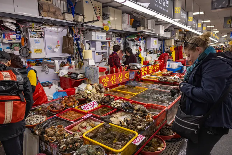 - Sample Seoul street food at Gwangjang Market and explore Busan’s Jagalchi seafood market